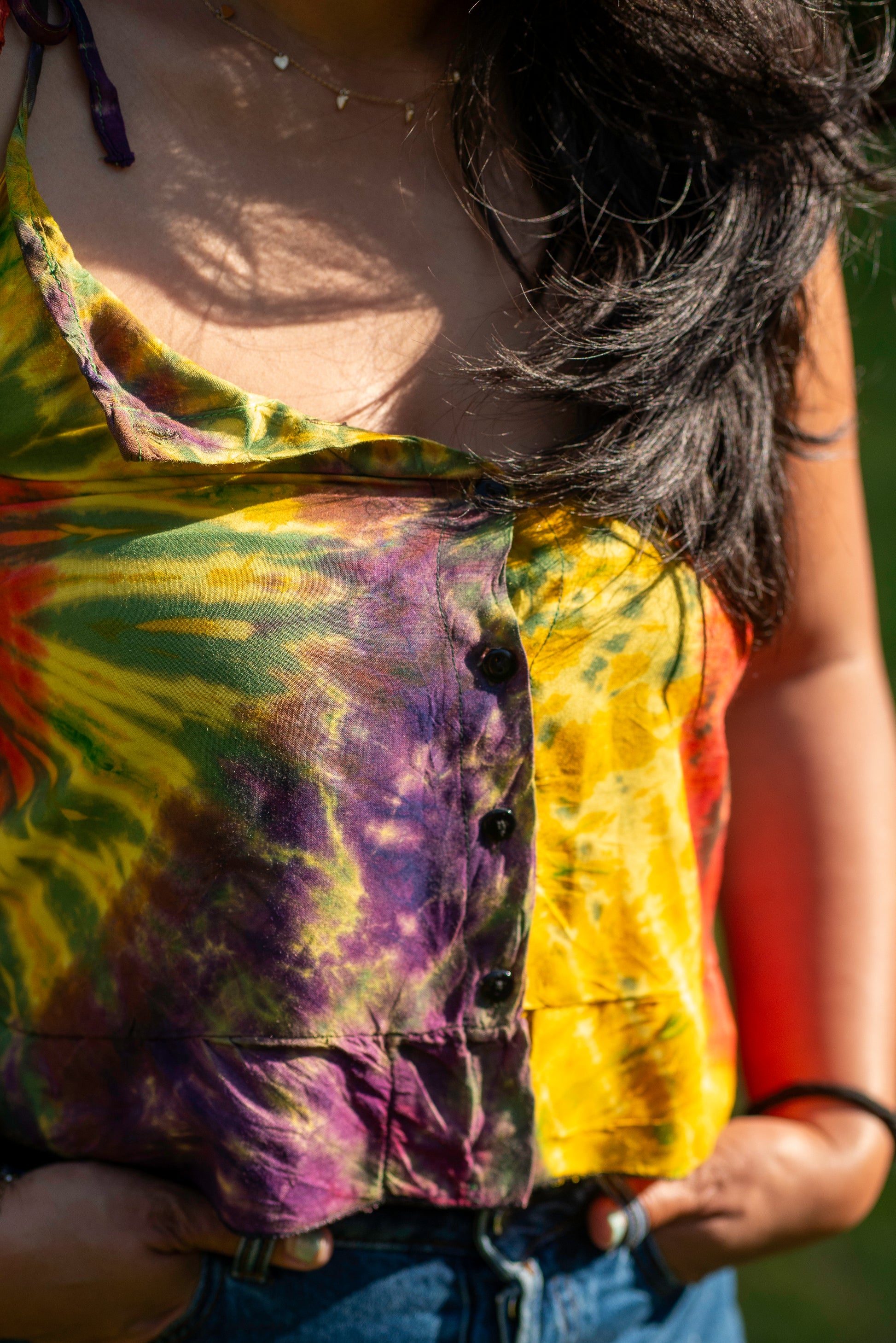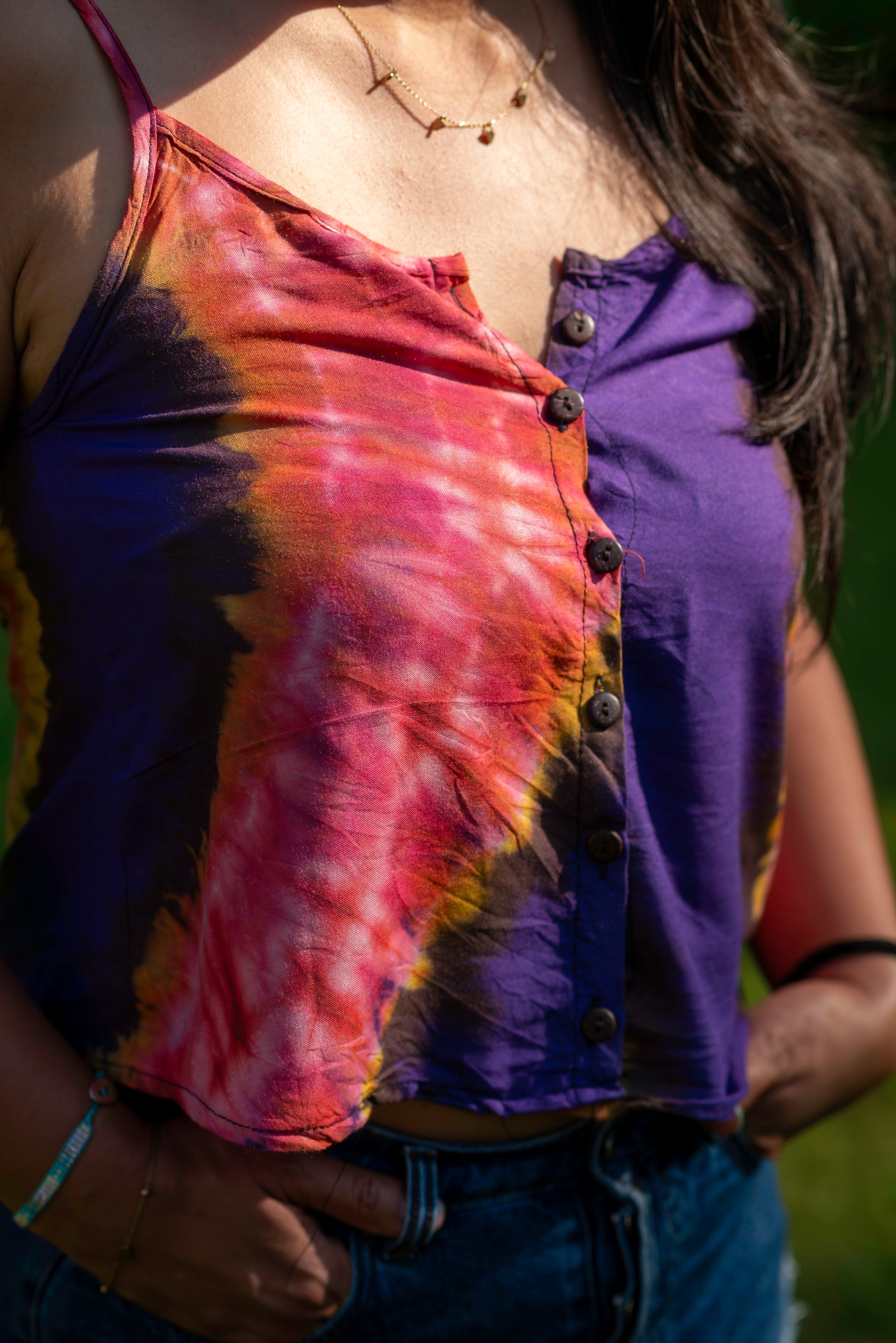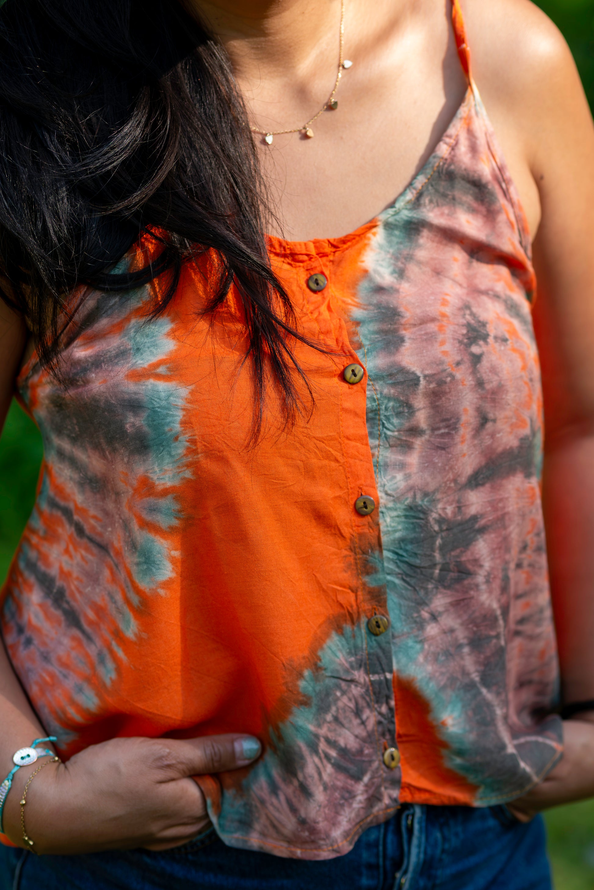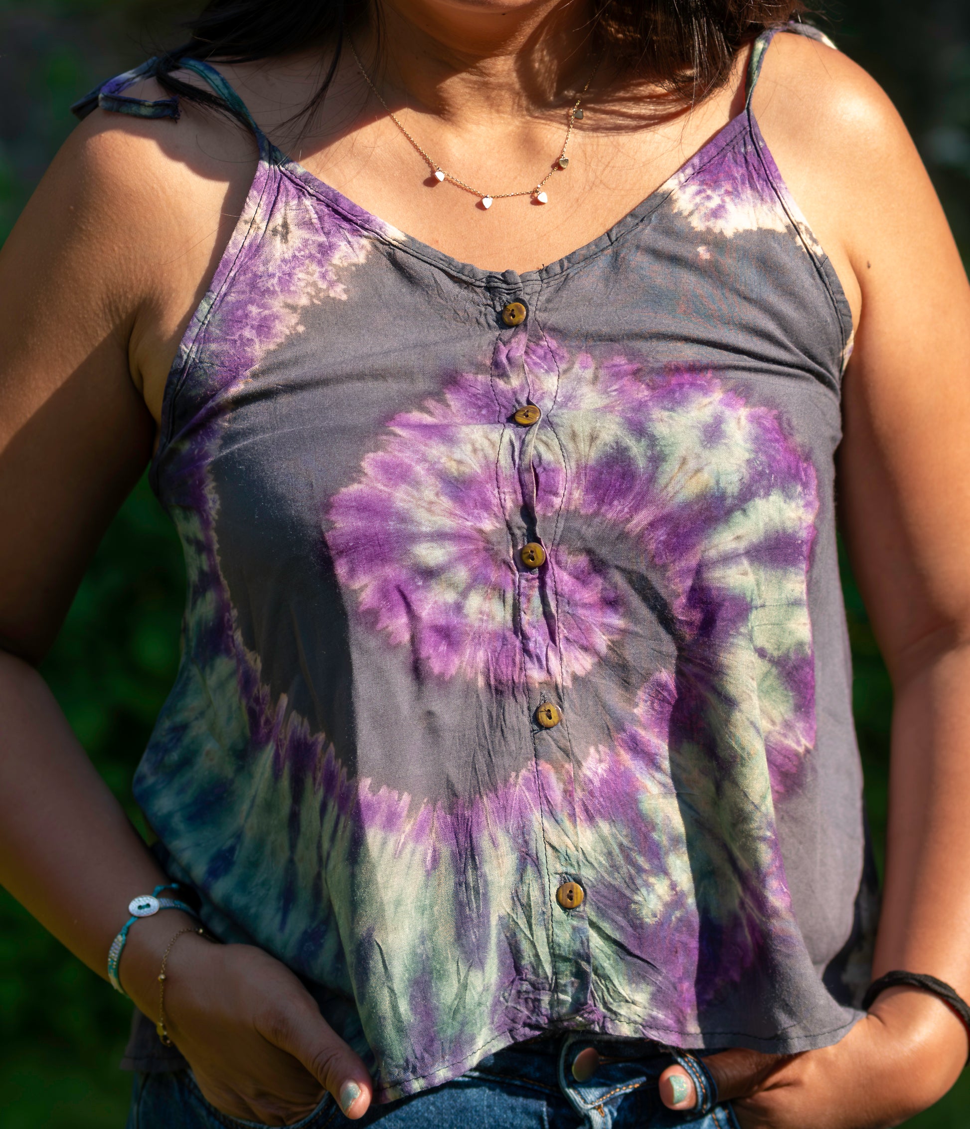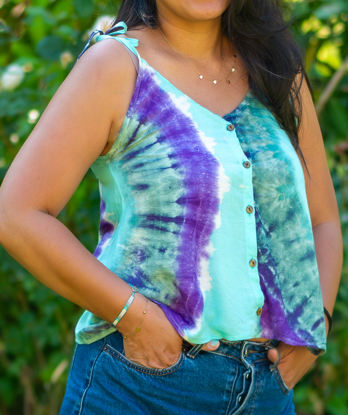 Embrace your inner free spirit with this stunning handmade tie-dye sleeveless top. Featuring authentic coconut buttons and adjustable tie straps, this airy camisole is the perfect piece of women's festival wear. A vibrant and unique boho top designed for sunny days, beach trips, and adding a splash of color to your everyday wardrobe.