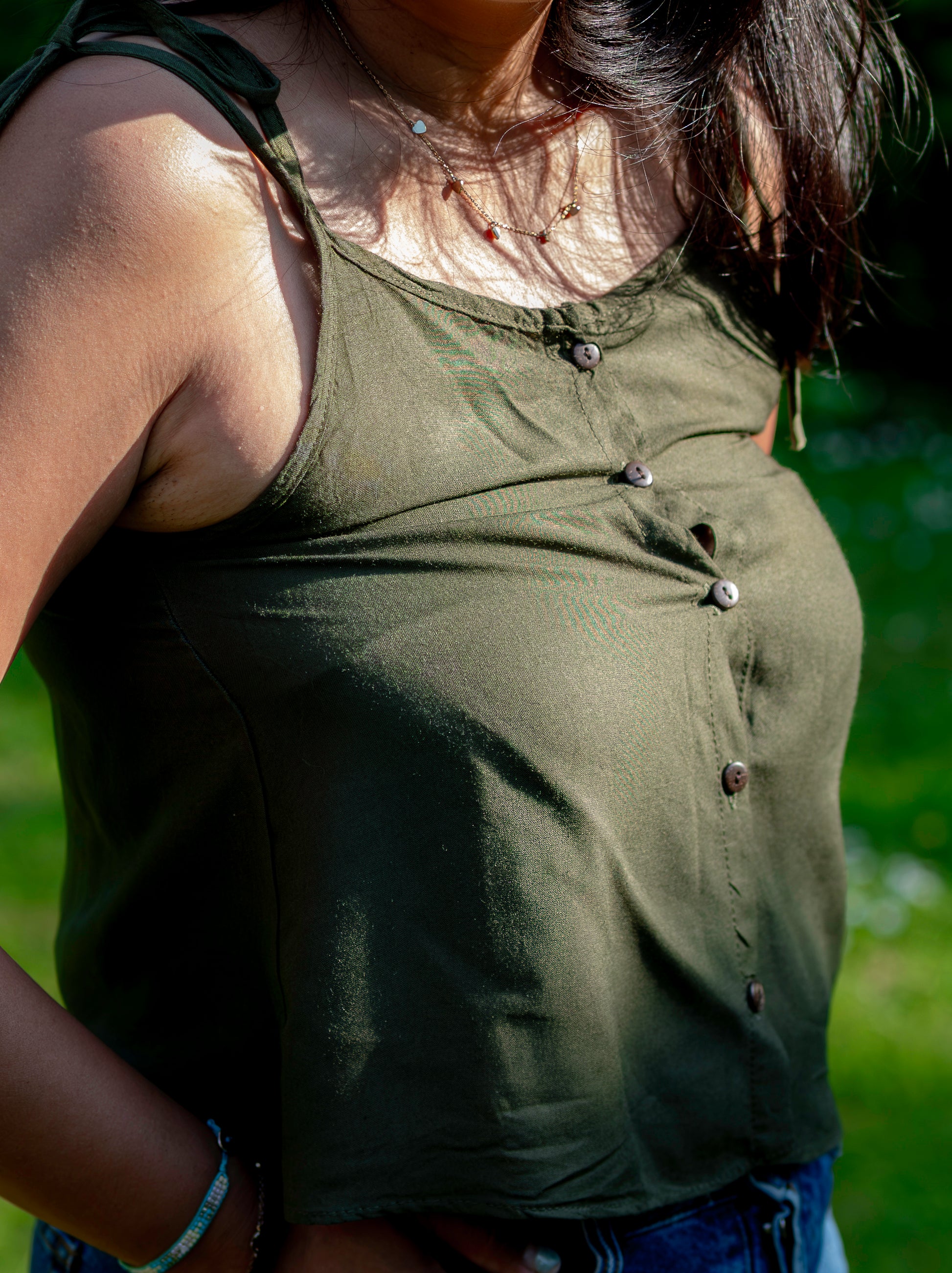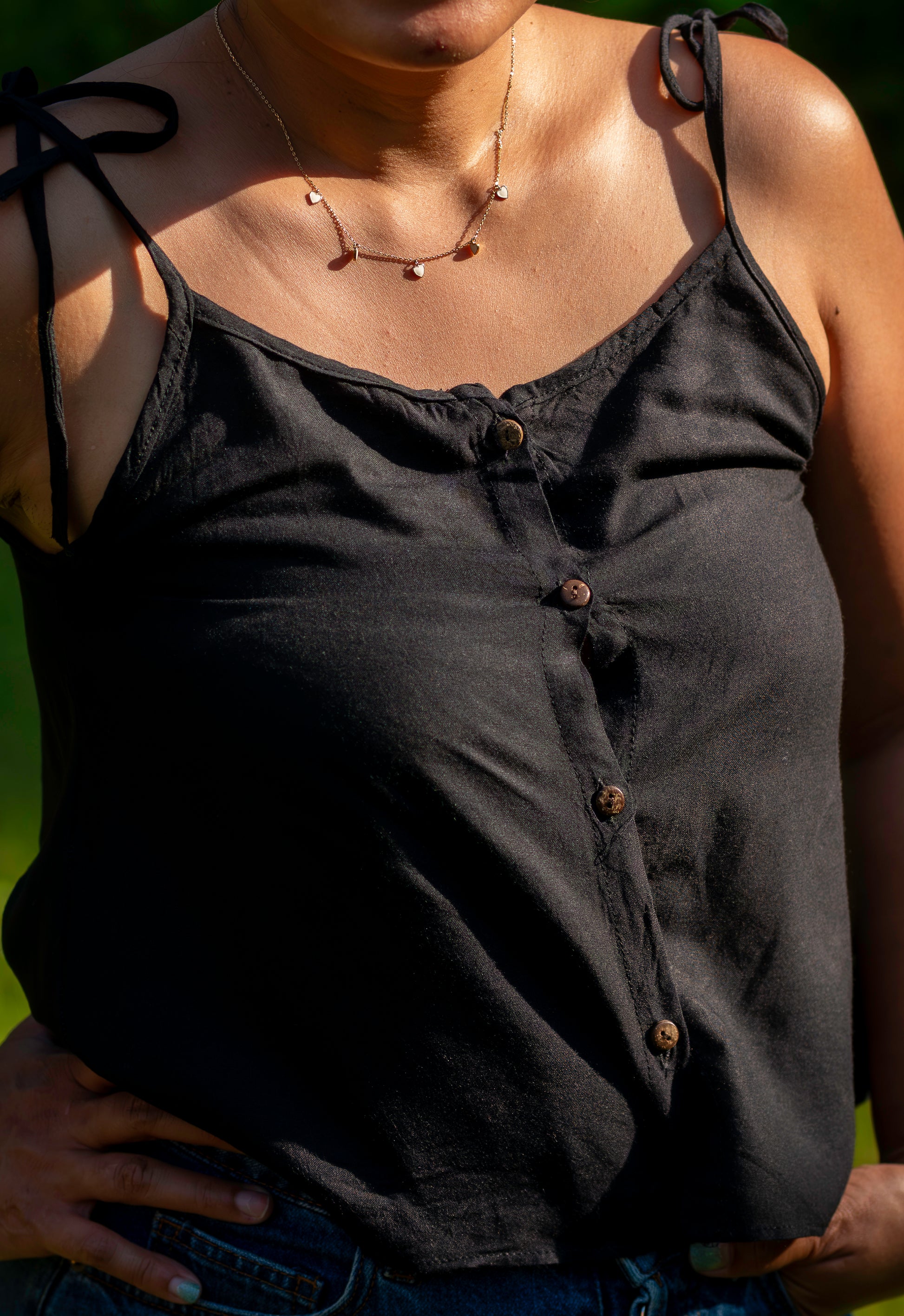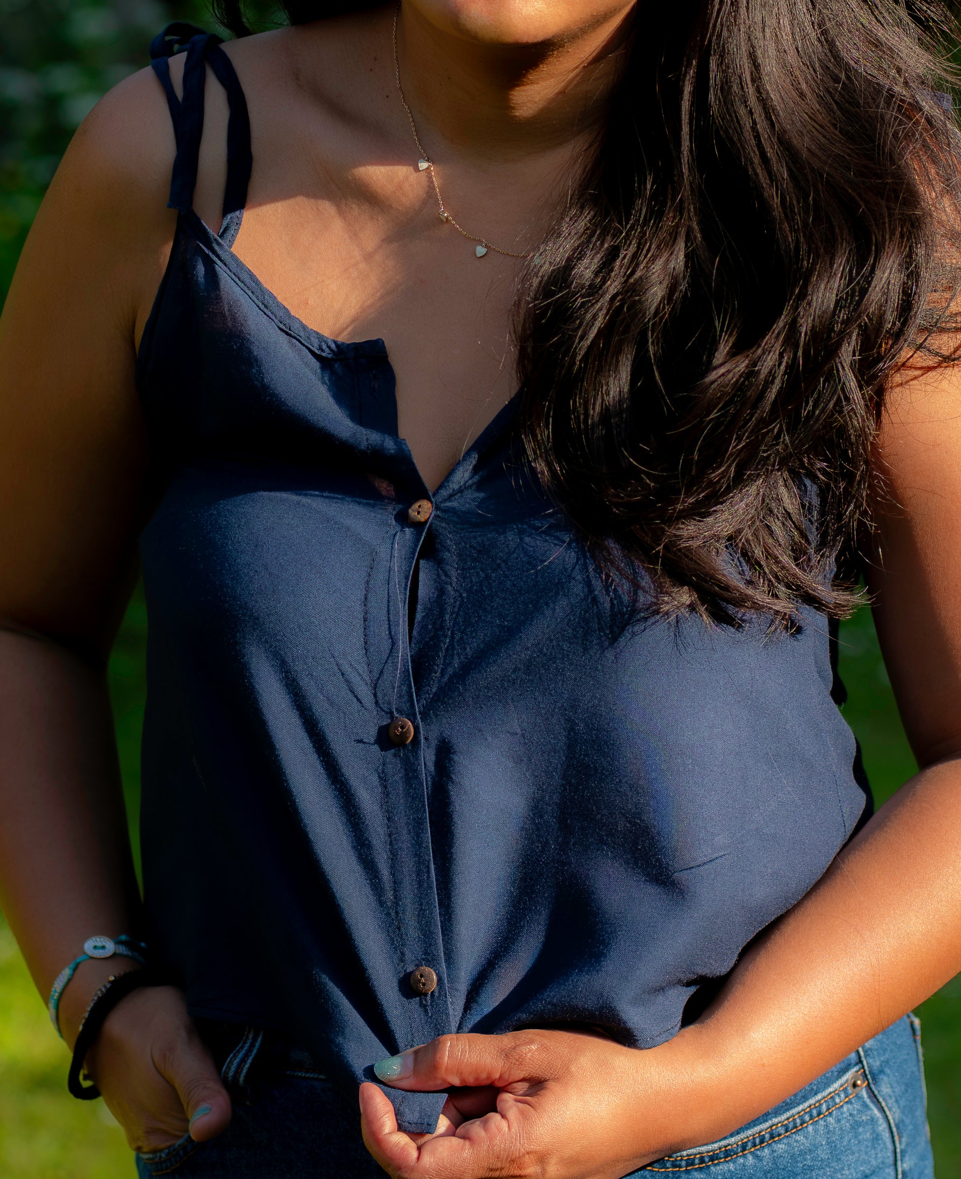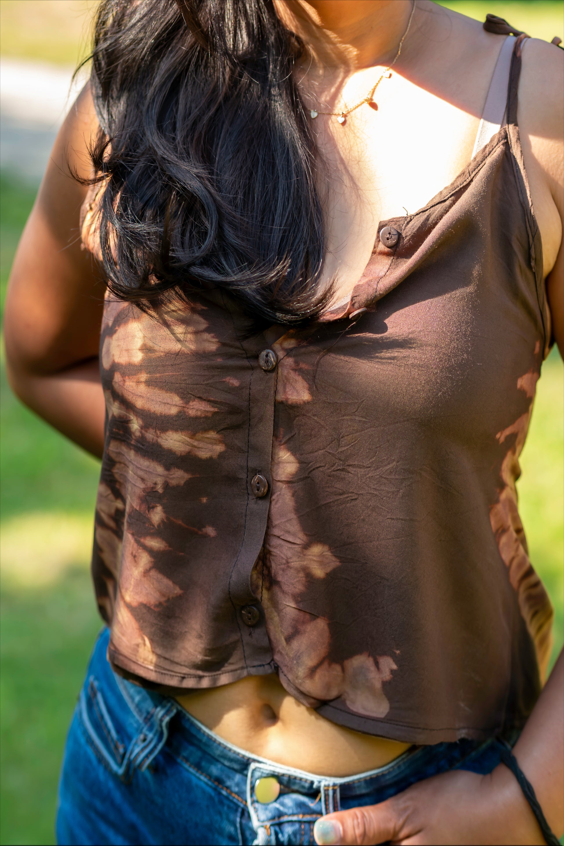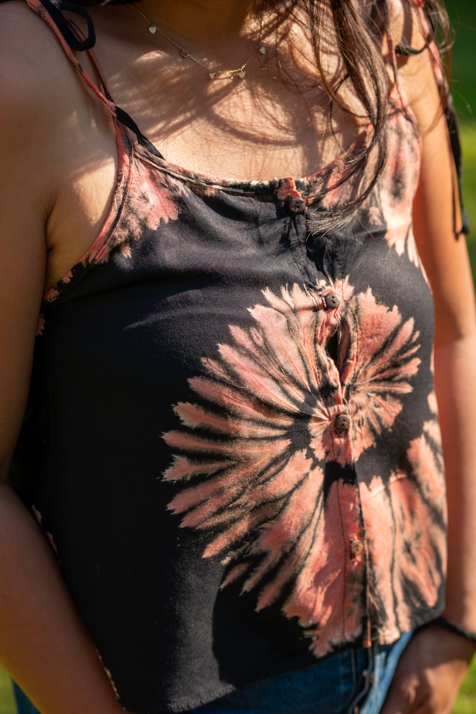 Embrace your inner free spirit with this stunning handmade tie-dye sleeveless top. Featuring authentic coconut buttons and adjustable tie straps, this airy camisole is the perfect piece of women's festival wear. A vibrant and unique boho top designed for sunny days, beach trips, and adding a splash of color to your everyday wardrobe.